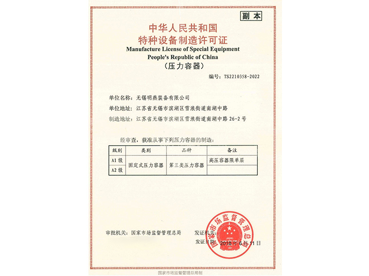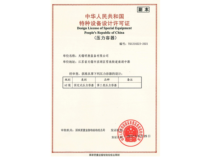 Copy right ? 2020 無錫明燕裝備有限公司具有一二三類壓力容器設計制造、ASME設計制造許可證